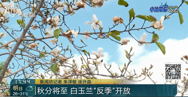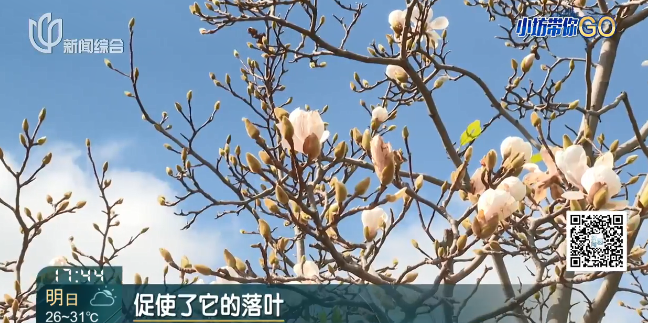 专家解释,这场"错季花开",与今年夏天的连续高温天密切相关,部分玉兰树为应对不利环境条件带来的生存压力,会通过落叶提前进入"保护性休眠"。这两天,气温逐渐走低,雨水又较为充足,环境解压后,树体从休眠中苏醒,重新抽芽,于是便有了这二次开花。