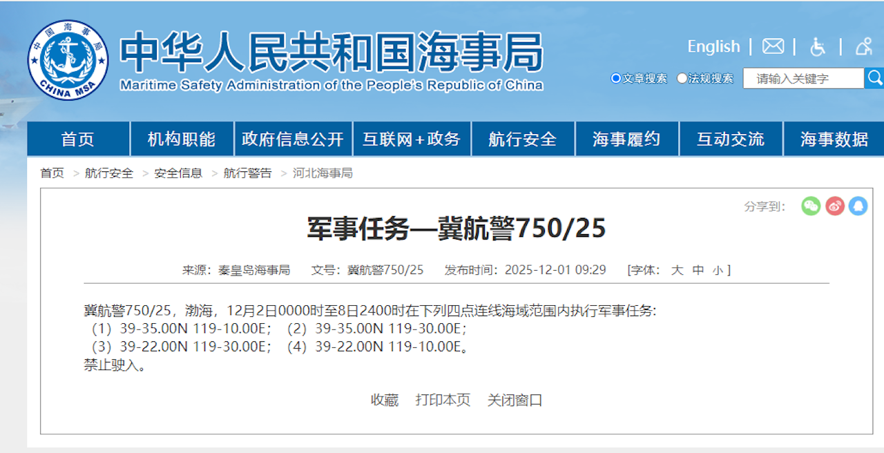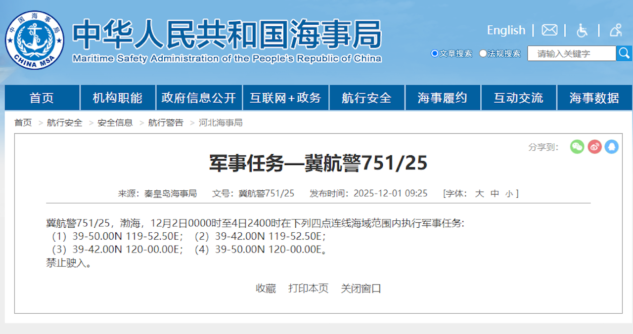 据中国海事局网站消息,秦皇岛海事局发布航行警告,12月2日0时至4日24时、12月2日0时至8日24时,渤海部分海域执行军事任务,禁止驶入。