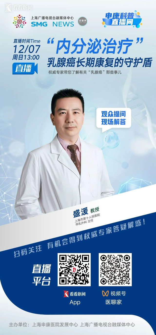 乳腺癌是女性最常见的癌症之一。而大多数激素受体阳性的乳腺癌患者在术后要接受内分泌治疗,这是乳腺癌综合治疗中最主要的治疗手段之一,也是保障患者长期康复、防止复发的关键“生命线”。但是很多患者会担心,在长期用药过程中,出现副作用了怎么办?耐药了又该如何应对?本期节目中,我们非常荣幸地邀请到了上海市第十人民医院甲状腺乳腺外科主任盛湲教授,做客直播间。