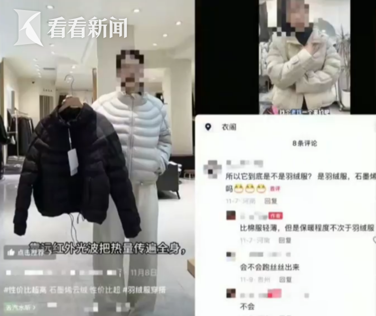 随着降温,社交平台上:今年别买羽绒服,买石墨烯云绒的声音迅速走红。博主们称它更轻、更暖、不跑绒、还能自动发热。但记者发现,这类外套售价多在100至200元,主要成分是聚酯纤维。