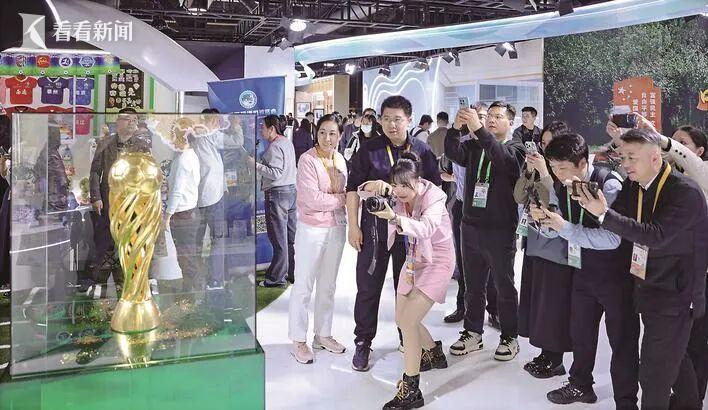第八届中国国际进口博览会正在如火如荼地进行中。而在以“江河风物,美好如苏”为主题的江苏人文交流活动展区聚势苏超”板块,特意设计了直径达6米的足球形态空间结构,伴有常州恐龙园的网红恐龙“角角”“犟犟”助阵,而前不久由泰州队夺得的“苏超”冠军奖杯更是惊喜亮相现场。