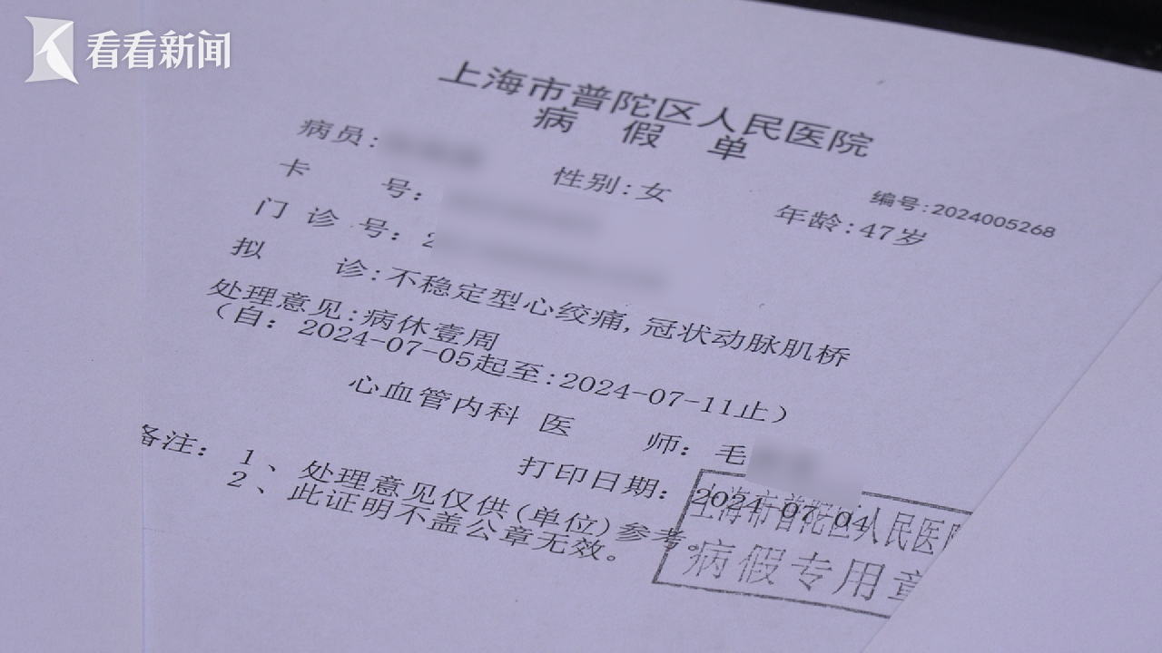 陈女士说,在之前工作的半年里,她频繁发生心绞痛,但都没去就医,查出来心肌桥后就一直在请病假,公司在8月初的时候,给她开了旷工通知,让她到岗,由于她没有到岗就被开除了。