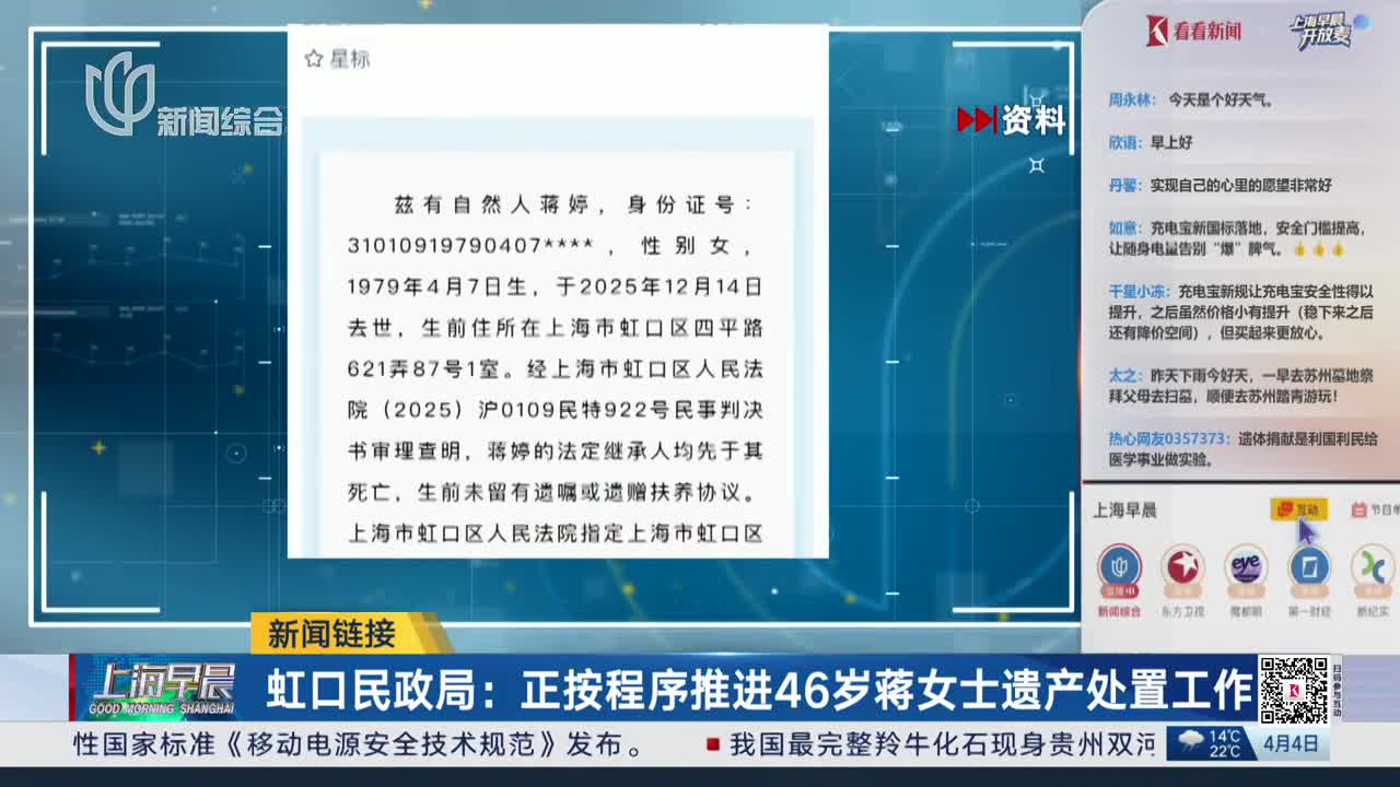新闻链接 虹口民政局:正按程序推进46岁蒋女士遗产处置工作