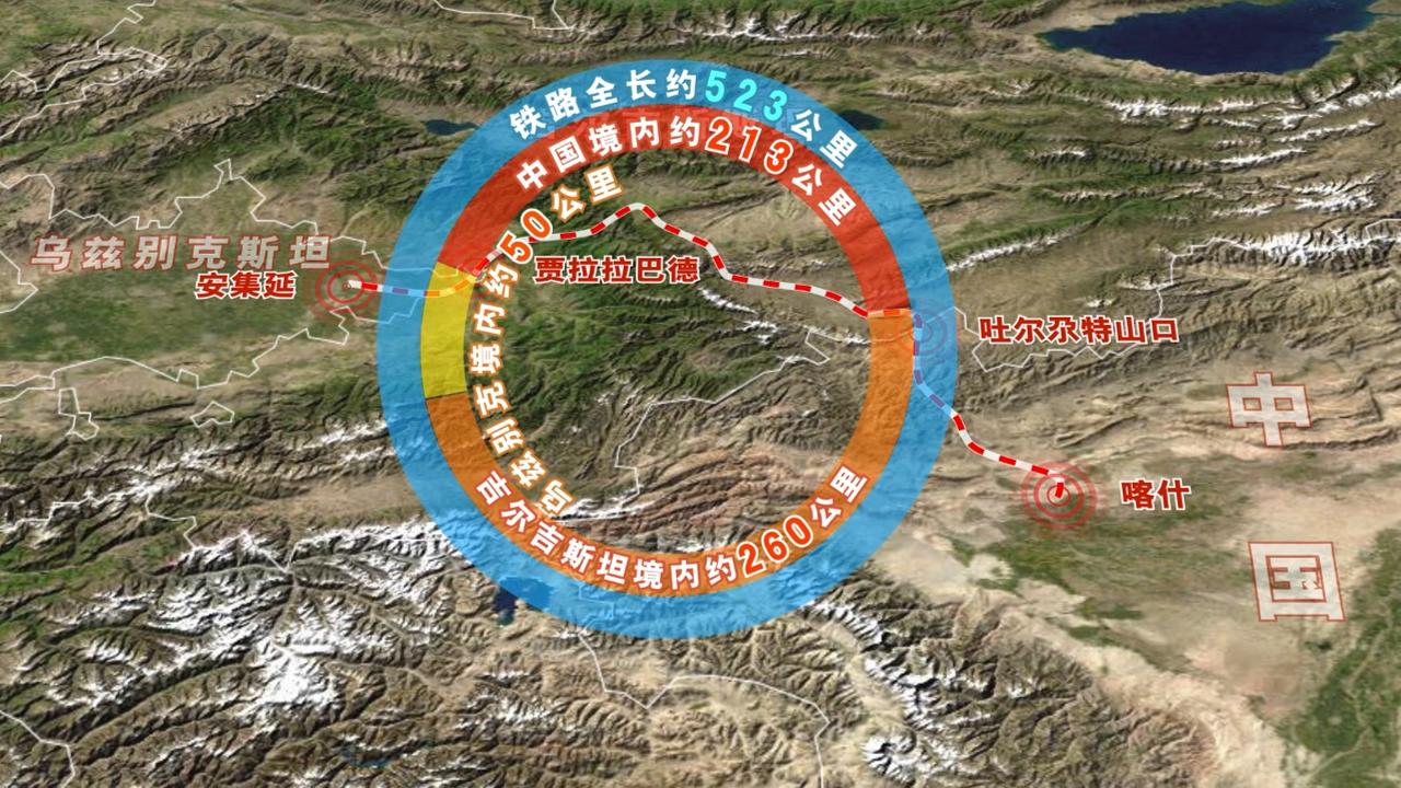 中吉乌铁路起自中国新疆喀什,经吐尔尕特山口进入吉尔吉斯斯坦,再向西经其边境城市贾拉拉巴德,终至乌兹别克斯坦东部城市安集延,全长约523公里。