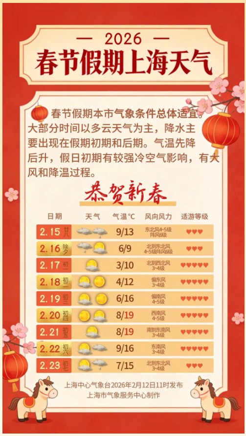 春节假日初期受较强冷空气影响,有一次大风降温过程,并伴有小雨;陆地最大阵风6~7级,沿江沿海地区、长江口区、洋山港区和上海市沿海海面7~8级;15~17日最低气温降幅可达6~8℃,部分郊区可能达到寒潮标准。