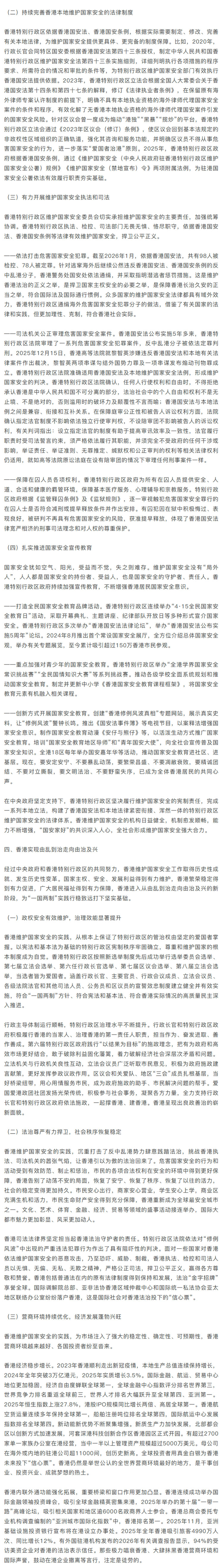 白皮书指出,香港维护国家安全的实践,本质上是坚持和发展“一国两制”事业的实践,是保护750万香港居民的基本人权、尊严和福祉的实践,是促进世界和平与发展的实践。当今世界百年变局加速演进,中国发展环境面临深刻复杂变化,维护国家安全只有进行时,没有完成时。中央政府坚定支持香港特别行政区全面准确贯彻“一国两制”方针,坚定扛起维护国家安全的宪制责任,持续筑牢国家安全屏障,以高水平安全护航“一国两制”实践行稳致远。