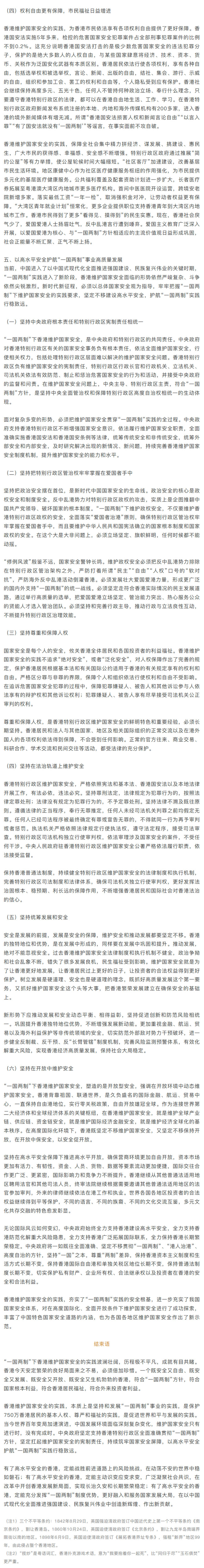 白皮书强调,进入新时代,以习近平同志为核心的党中央全面准确、坚定不移贯彻“一国两制”方针,强调维护国家主权、安全、发展利益是“一国两制”方针的最高原则。面对香港局势动荡变化,中央政府坚持总体国家安全观,依照宪法和基本法有效实施对特别行政区的全面管治权,制定实施香港特别行政区维护国家安全法,落实“爱国者治港”原则,支持香港特别行政区切实履行维护国家安全的宪制责任,依法有效防范、制止和惩治危害国家安全的行为和活动,香港进入从由乱到治走向由治及兴的新阶段,展现出光明前景。