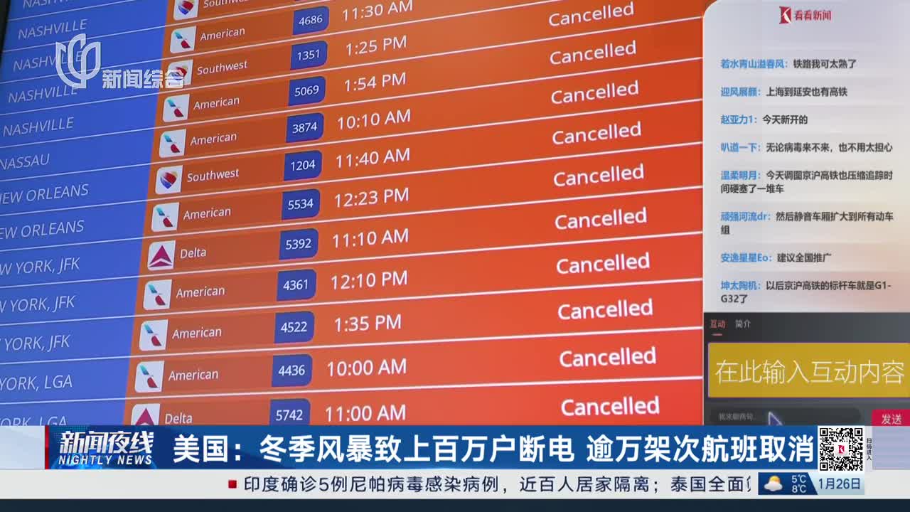 美国:冬季风暴致上百万户断电 逾万架次航班取消