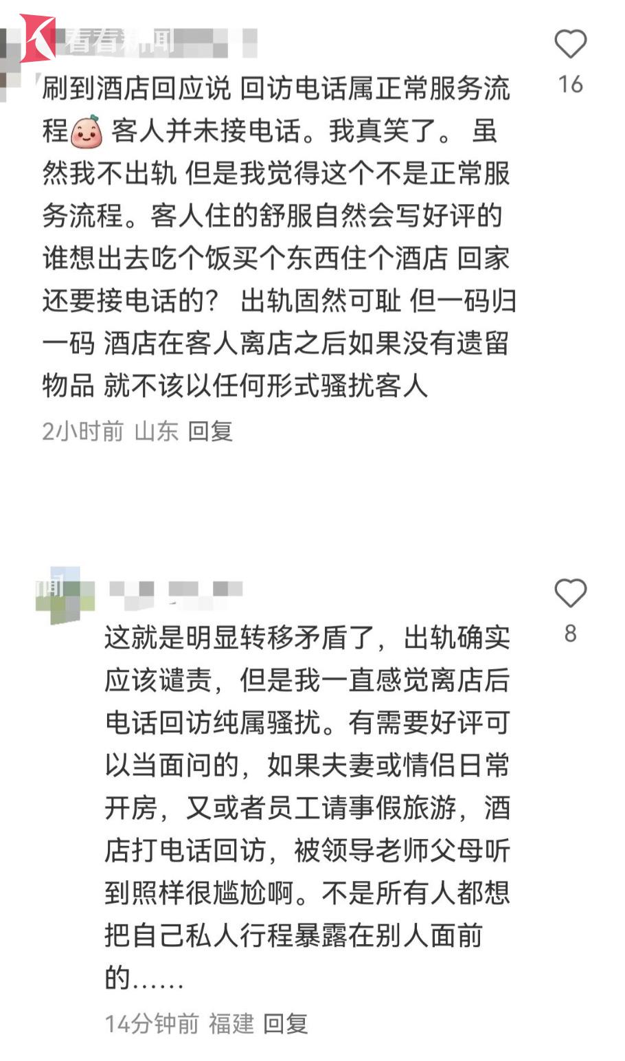 不少评论认为,此事的当事人是私德有亏、咎由自取,指出“导致离婚的是出轨行为而不是酒店电话”。另一方面,也有消费者对酒店回访不胜其烦,认为尴尬且泄露隐私,“不是所有人都愿意暴露私人行程”。