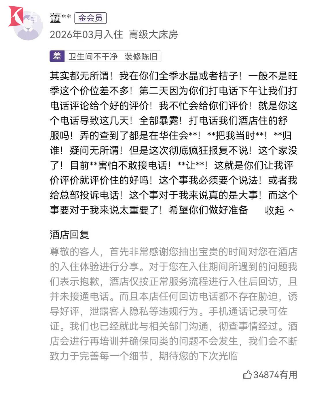 对此,华住会官方客服今天回应称,经核实,酒店在该客人退房后,是按正常服务流程回访询问客人入住感受,但并未接通电话,也不存在胁迫、诱导好评、泄露客人隐私等违规行为,当事人若接到电话“可能是别的酒店打的,或无差别攻击”。目前,华住会已经就此与相关部门沟通,彻查事情经过。