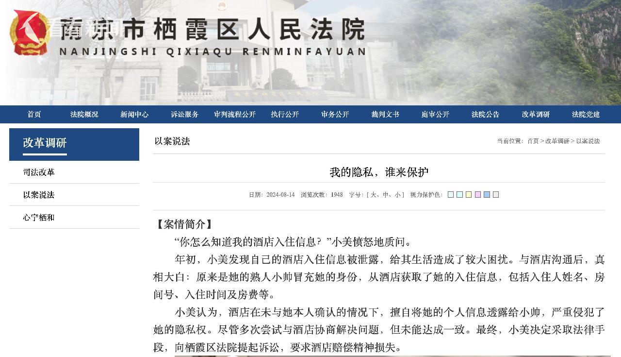 事实上,酒店住店隐私纠纷屡见不鲜。2024年8月,南京栖霞区法院就曾公布一起类似案例:一名女子入住连锁酒店后,酒店把她的入住时间等信息泄露给了冒充她身份的男友,女子因此将酒店告上法庭,最终法院判决酒店赔偿精神损失费1000元。去年,广州白云法院也有一家酒店未经入住人同意,擅自将其个人信息提供给同住人用于提起诉讼,法院认为其构成侵犯隐私权,判决限期对当事人赔礼道歉。
