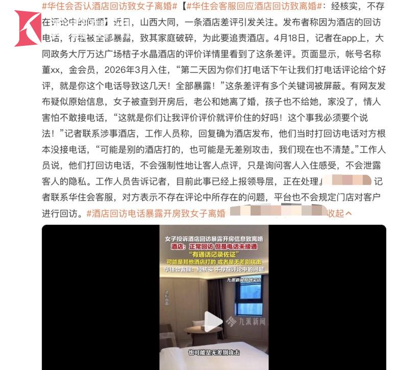 近日,网传华住集团旗下的山西大同政务大厅万达广场桔子水晶酒店遭遇客人差评,引发网友关注。该住客称,酒店的一个回访电话致其出轨行程“全部暴露”并发生家庭纠纷乃至离婚,为此要向酒店讨说法。华住会APP显示,该酒店已有1万余条住客评价,涉事的董姓会员今年3月入住。目前经涉事酒店前台工作人员确认,董某确系该店会员,确实在该酒店入住并留下差评。