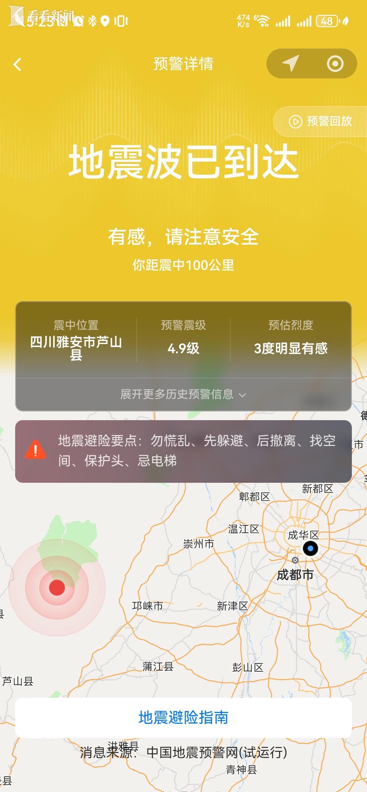 中国地震台网正式测定:10月12日15时21分在四川雅安市芦山县(北纬30.48度,东经103.09度)发生4.7级地震,震源深度10千米。四川成都、乐山等多地有震感。