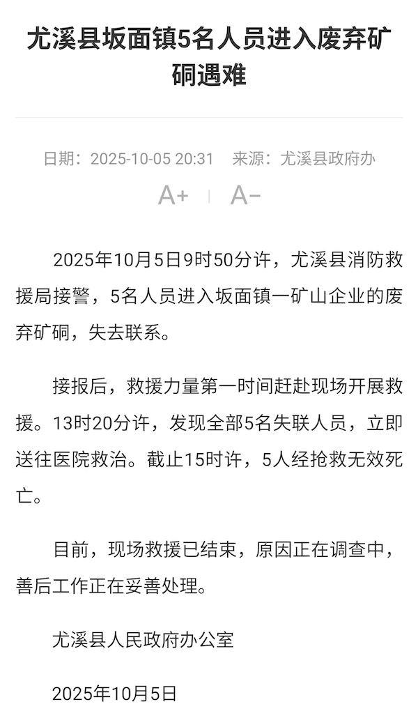 消防员接警后进行数小时搜救,发现全部失联人员,送医后5人经抢救无效身亡。尤溪县政府工作人员表示,事发地是一个废弃多年的金矿矿硐,硐口也被封住了。这5人都是外地人员,不知道是因为什么原因进硐,可能进去想拿点什么东西,结果出了意外。