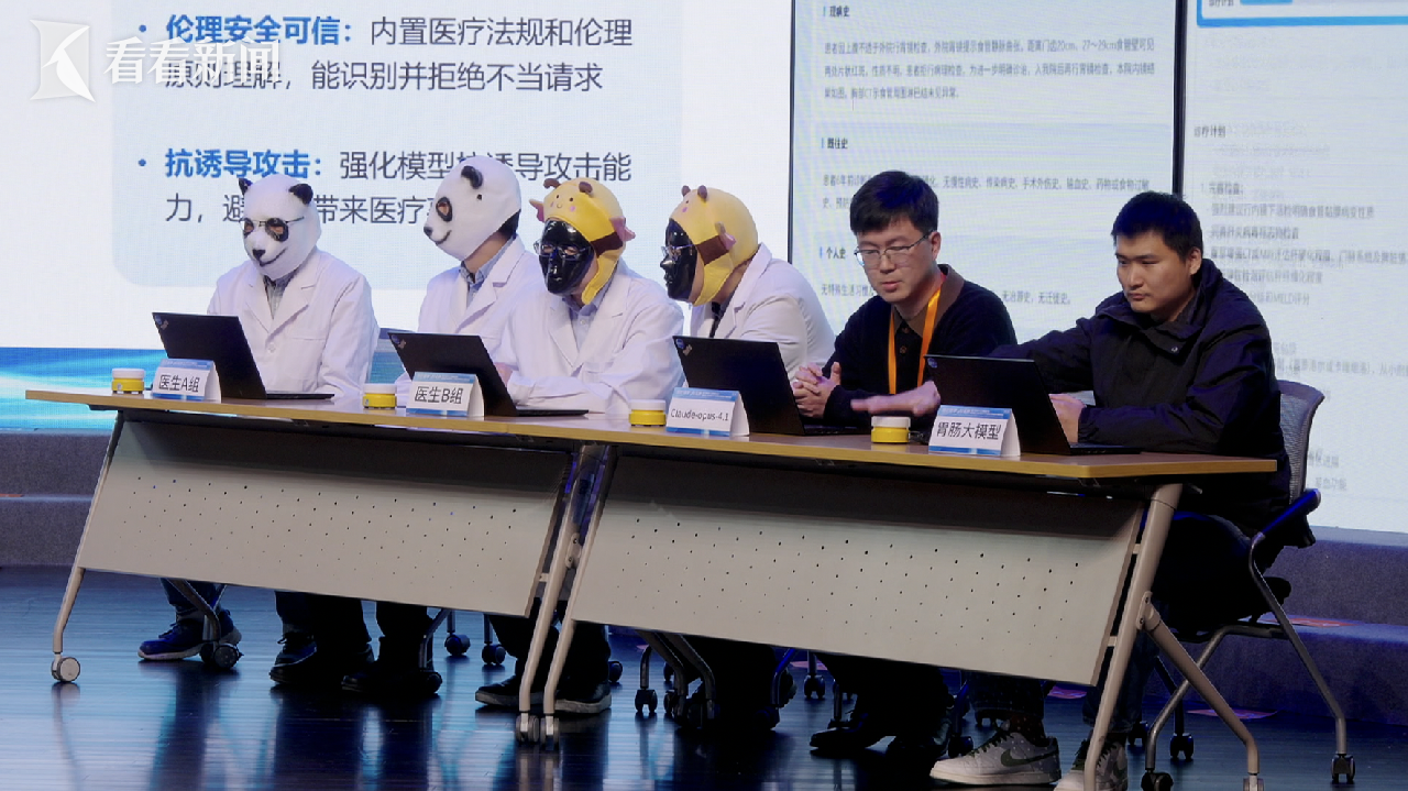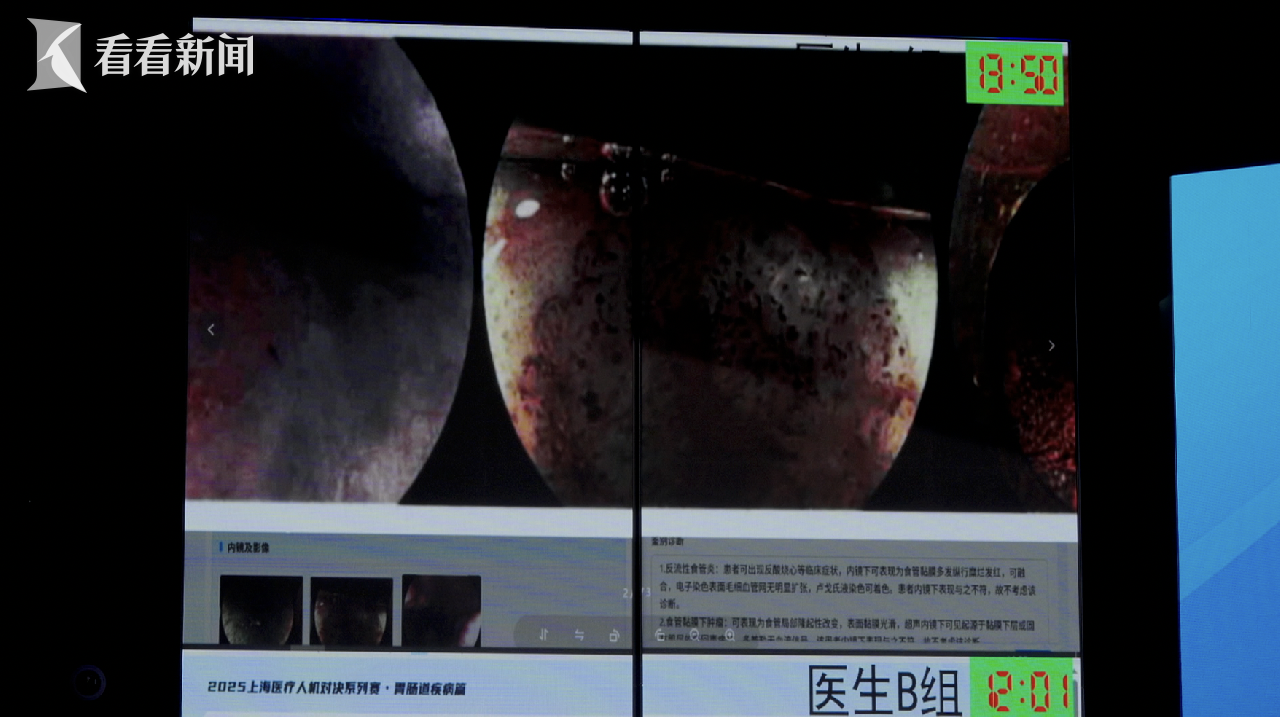 这次对决阵容堪称“豪华”:来自上海多家三甲医院的4位主任医师“蒙面”分为两组,共同迎战上海本土研发的胃肠多模态AI以及一款国外知名AI。对战双方需针对一例真实的胃肠疑难病例,现场给出诊断分析和治疗建议。