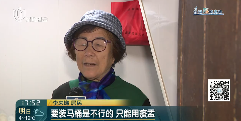 我们的房子很小,要装马桶是不行的,只能用痰盂。像我们都是八十岁的人了,蹲下去立不起来,立着蹲不下去,没有办法。再加上这个地方还缺一个角,外面的扶梯在房子里,所以我们的房子很小,来了同事或者客人就没有办法,进不了房子。