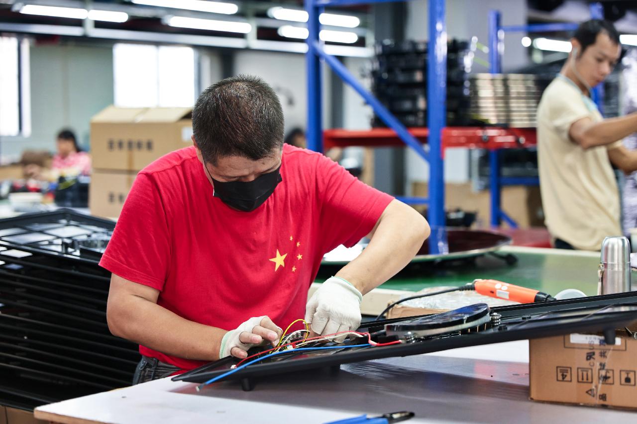 ▲工人正在为暖菜板安装电子元件。李源|摄