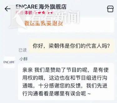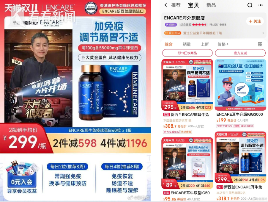其晒出的图片显示为一家名为“ENCARE海外旗舰店”的店铺,该店铺标识中含“天猫国际”字样,其售卖的产品中,有一款名为“新西兰ENCARE耳牛免疫球蛋白”的商品,商品首页图放置了梁朝伟半身照片。刘嘉玲晒出的图片中,同时还有主持人鲁豫的照片被使用。媒体查询发现,该款“新西兰ENCARE耳牛免疫球蛋白”售价200多元一瓶,梁朝伟照片被放置在一款保健品商品图首页,但其详情及介绍页面均未提及梁朝伟是否为该产品代言人。