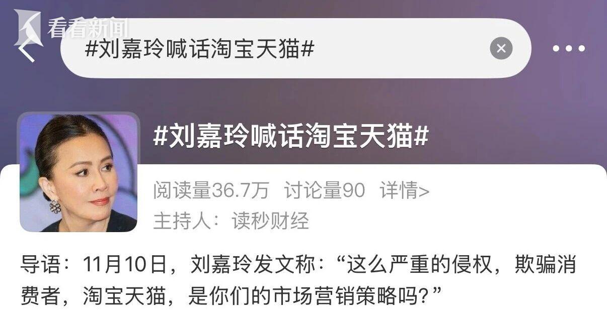 11月10日,刘嘉玲在社交平台晒出两张淘宝界面截图,并喊话淘宝、天猫:“这么严重的侵权,欺骗消费者,淘宝、天猫,是你们的市场营销策略吗?”