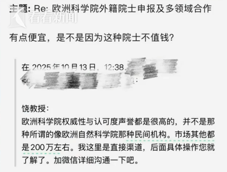 明码标价95万,就能申报欧洲科学院外籍院士?知名教授、学者饶毅近日在公众号发文称,自己收到了一封“花钱买院士头衔”的信息推广邮件。他还透露,有多名学者也收到了同样内容的邮件。评选院士,如何能成了一笔交易?事件引发了广泛关注和讨论。
