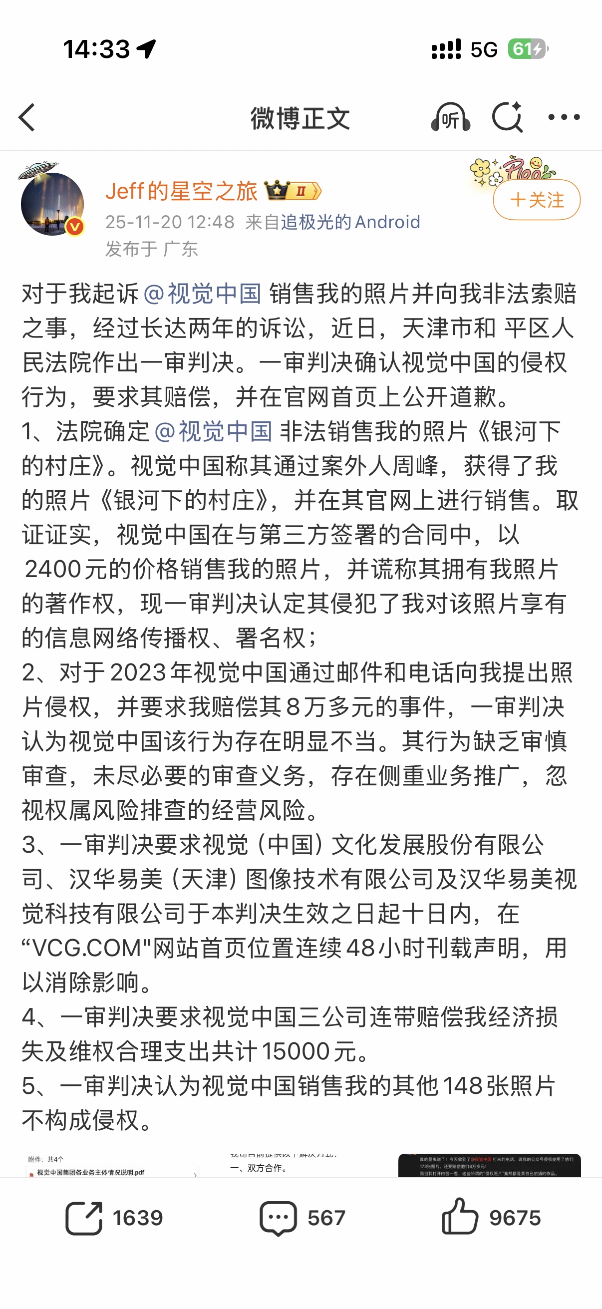 时隔两年,今年11月20日,摄影师戴建峰发文称,其起诉视觉中国侵权一案已由天津市和平区人民法院作出一审判决。