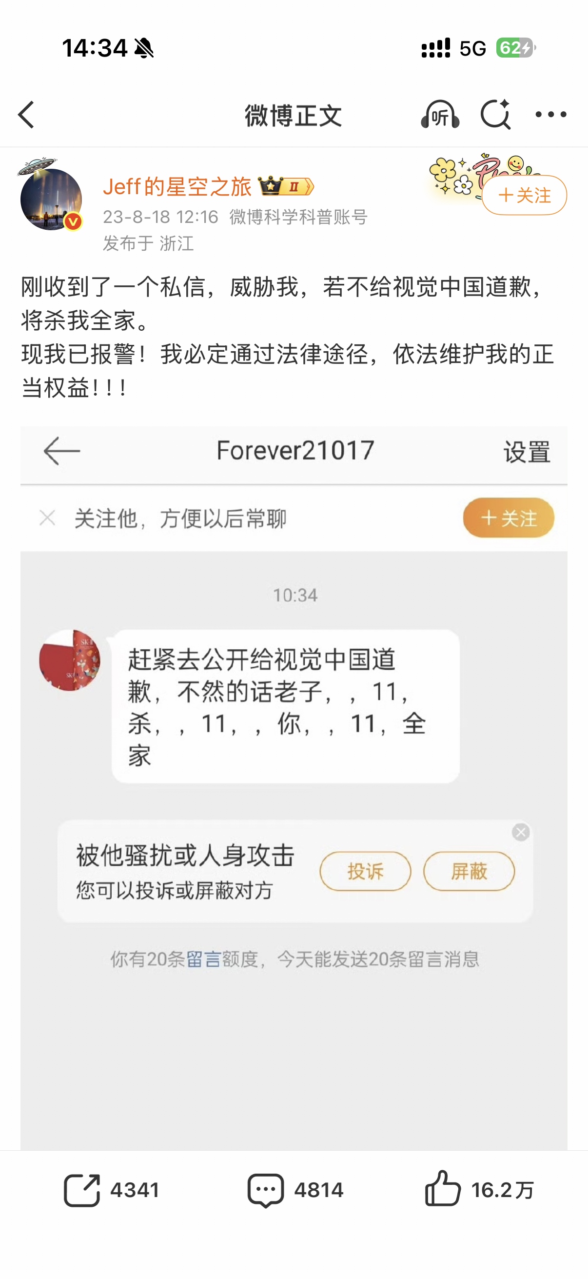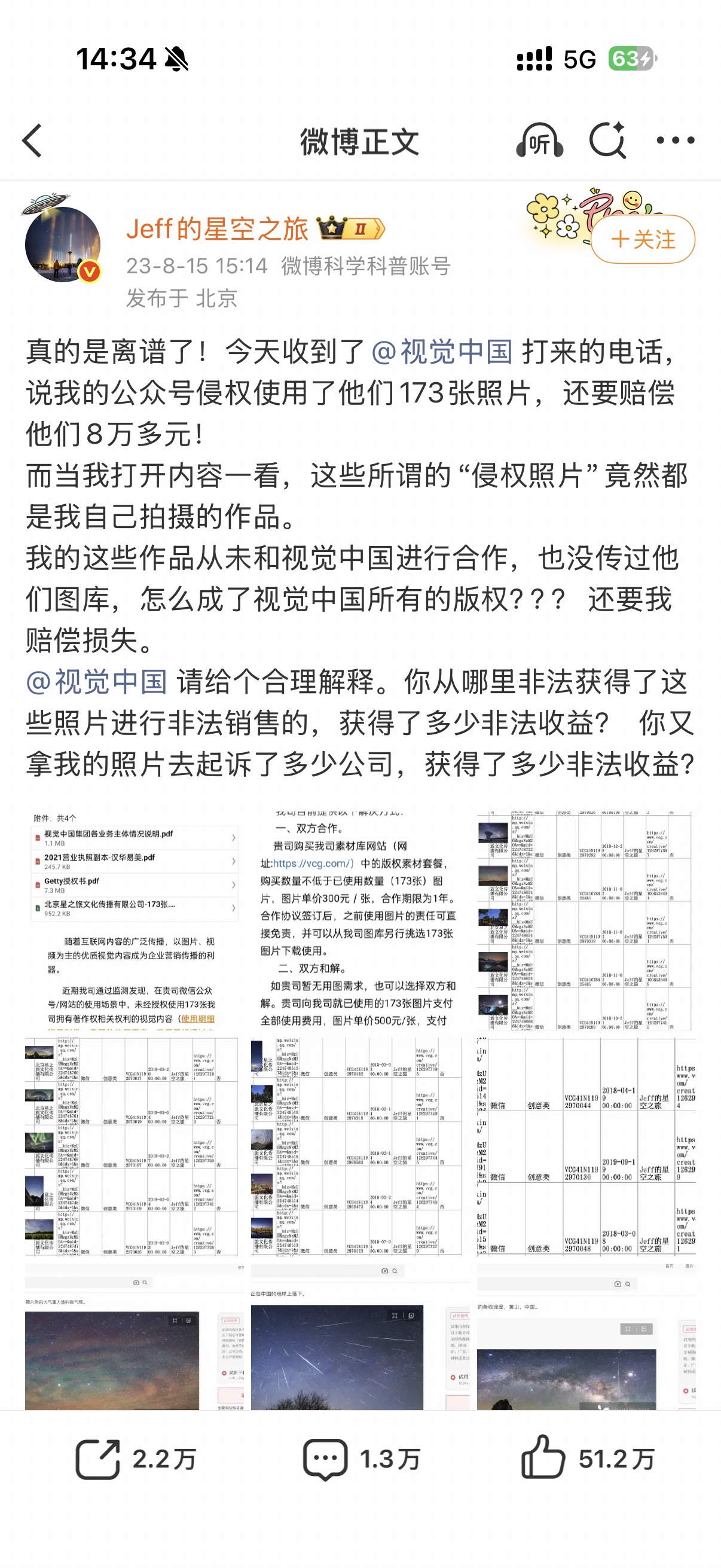 2023年,知名星空摄影师戴建峰发文称,视觉中国打来电话,宣称他的公众号侵权使用了视觉中国173张照片,并索要8万多元的版权费。戴建峰经查实发现,这些所谓的“侵权照片”居然是自己亲手拍摄的作品。
