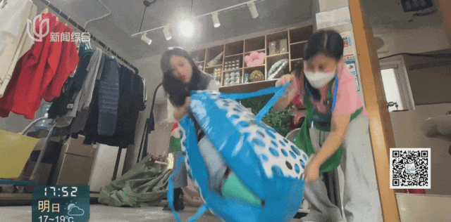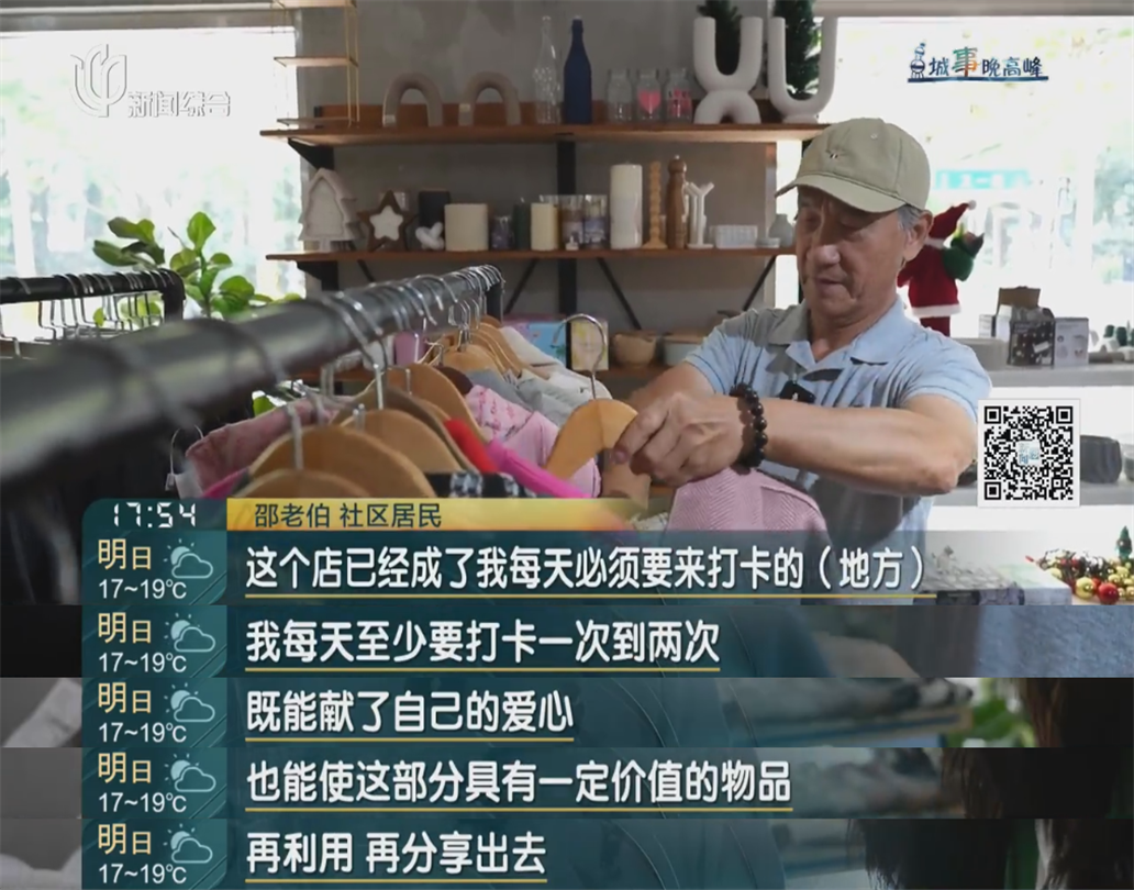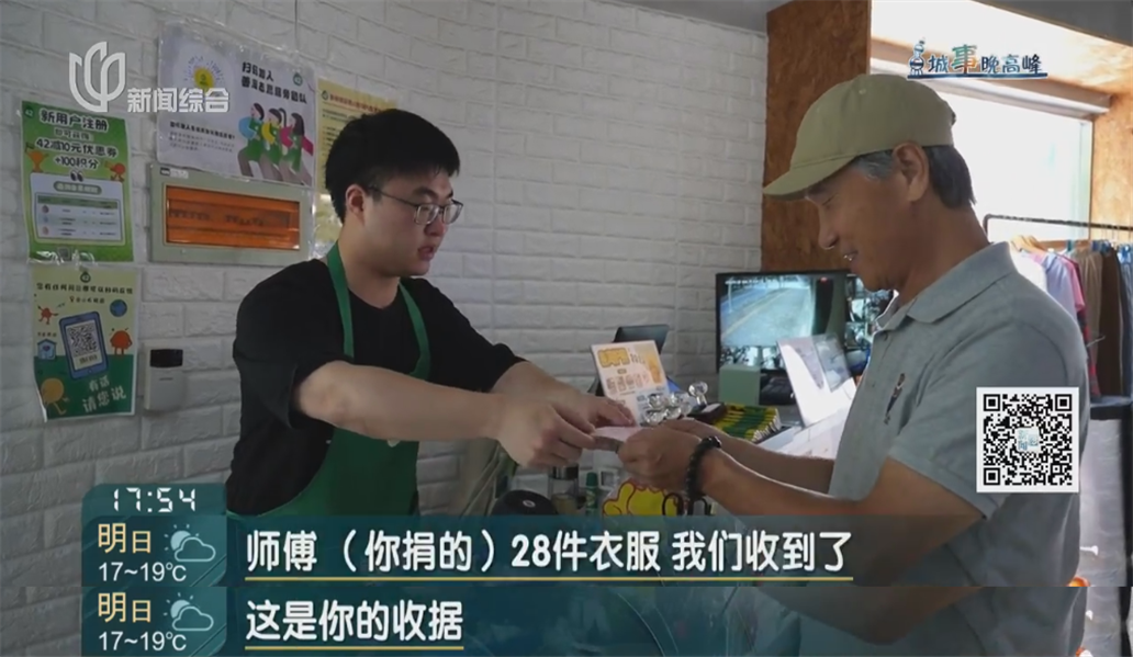 在慈善超市里,坊记遇到了住在附近的邵老伯。捐了28件衣服之后,他并没有着急回家,而是留下来帮忙整理货物、打理货架。