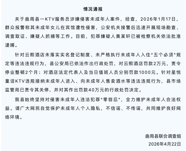 近日,河北一名14岁女孩在KTV饮酒后,被KTV服务员带入酒店实施性侵的消息引发舆论关注。昨天,河北邯郸曲周县发布通报称,经查,事件属实。目前,犯罪嫌疑人黄某轩已被批准逮捕。