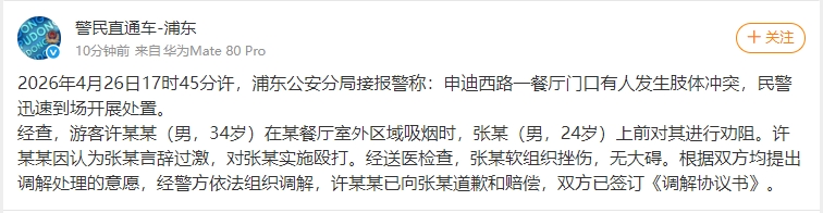对此,上海市公安局浦东分局在官方微博 @警民直通车-浦东 发布公告称,2026年4月26日17时45分许,浦东公安分局接报警称:申迪西路一餐厅门口有人发生肢体冲突,民警迅速到场开展处置。经查,游客许某某(男,34岁)在某餐厅室外区域吸烟时,张某(男,24岁)上前对其进行劝阻。许某某因认为张某言辞过激,对张某实施殴打。经送医检查,张某软组织挫伤,无大碍。根据双方均提出调解处理的意愿,经警方依法组织调解,许某某已向张某道歉和赔偿,双方已签订《调解协议书》。