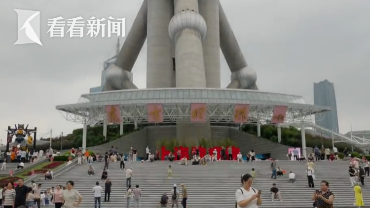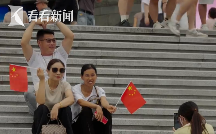 一早,东方明珠塔下的城市广场便迎来南来北往的游客。许多游客都带上了一面鲜红的国旗,与明珠塔合影留念。