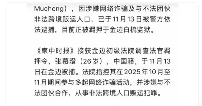 大反转,以为是失联,实则是落网。据多家媒体报道,在网络上拥有十多万粉丝的网红“橙子姐姐”在家人报失联7天后,被曝在柬埔寨落网。柬埔寨当局昨天证实,“橙子姐姐”因涉嫌网络诈骗及与不法团伙非法跨境贩运人口,已于11月13日被柬埔寨警方依法逮捕,目前正被羁押于金边白梳监狱。