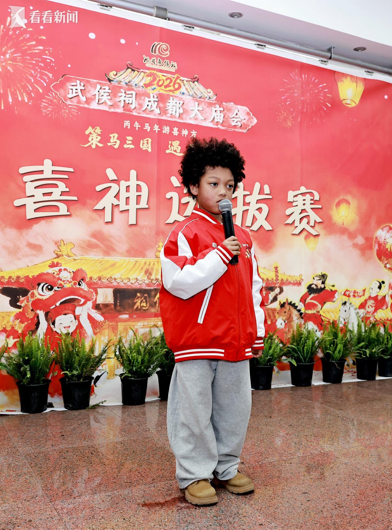 作为传统年味的国际范儿担当,国际小喜神一直备受关注。今年,成都武侯祠博物馆专门推出英语、法语、德语、俄语、西班牙语、泰语等多语种招募短视频,并通过华尔街周刊网、美国时报网等全球30多家国际知名网站面向全球开启招募。最终中葡混血的丫米、中法混血的Jason、中国巴基斯坦混血先爱莎和先爱华姐弟俩以及中葡混血的Tici五位适龄儿童入选今年的国际小喜神。2月3日活动现场,5位“国际小喜神”一一亮相,并各自带来了一段精彩的文艺表演。