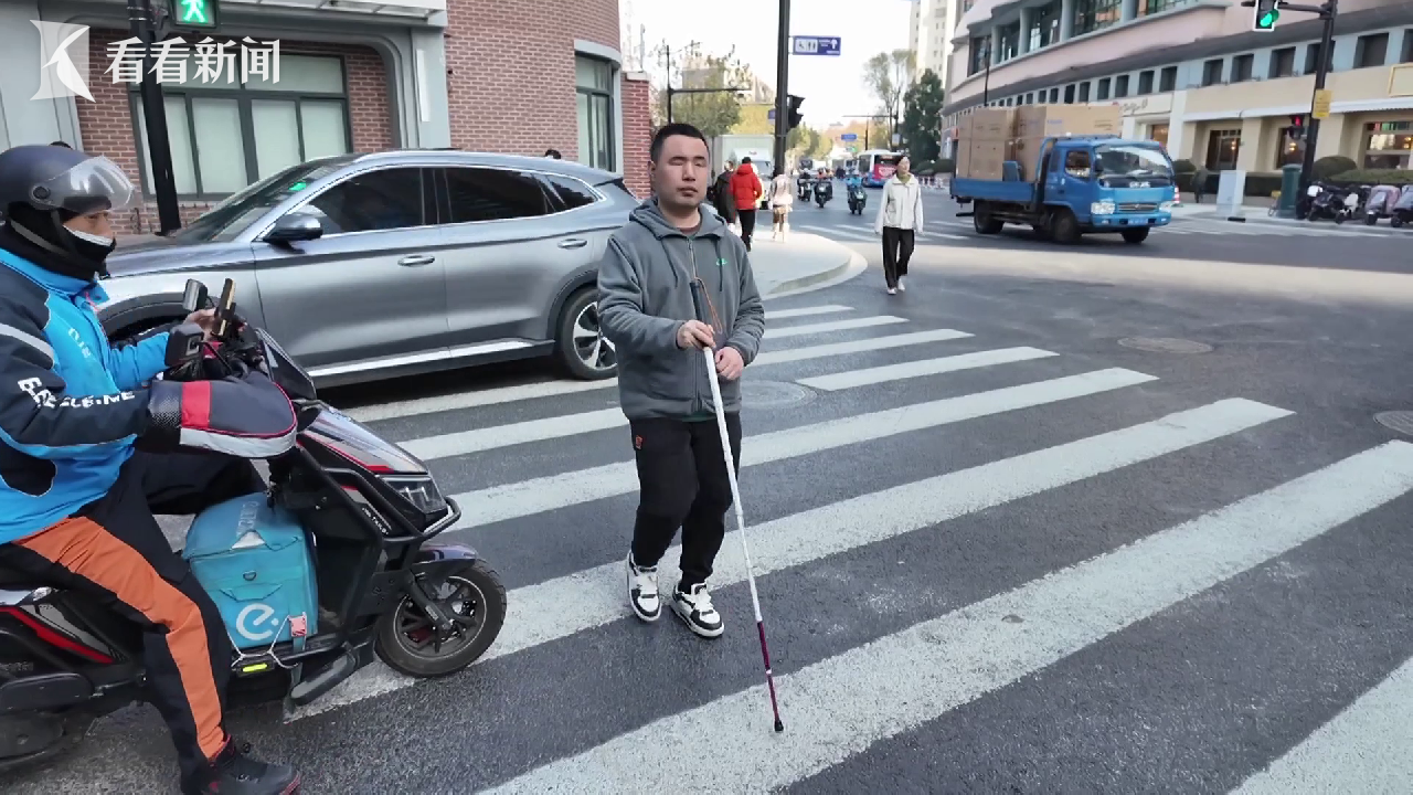 因此他们综合了多方反馈,还是将斑马线恢复了原样,转而先采用了语音提示的方式,后续可能会在优化方案后,再行试点铺设过街盲道。那么,平时视障人士过马路的体验到底如何呢?我们跟着上海市盲童学校的老师任铮浩走了一段,在水城南路与延安西路交叉路口,这是一个约100米长需要“二次过街”的路口。但是斑马线上没有盲道,也没有语音提示,盲人要过街,只能靠手机里的智能软件帮忙。