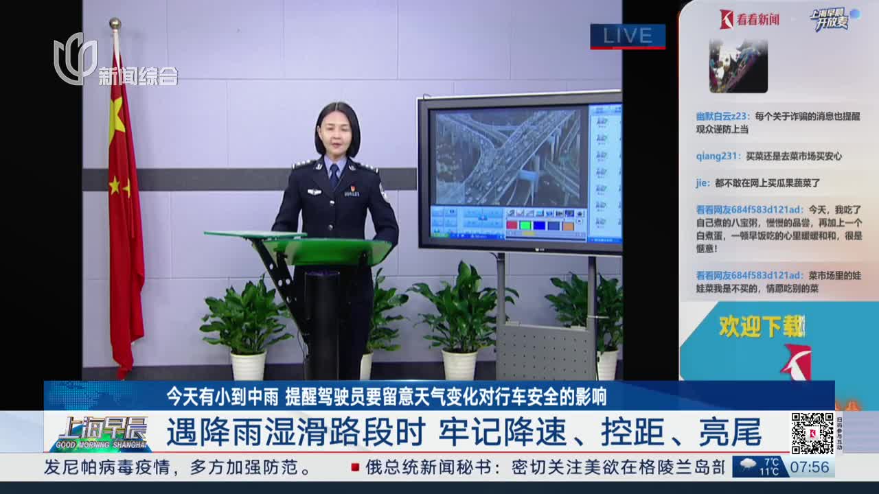 交通连线:今天有小到中雨 提醒驾驶员要留意天气变化对行车安全的影响 遇降雨湿滑路段时 牢记降速、控距、亮尾