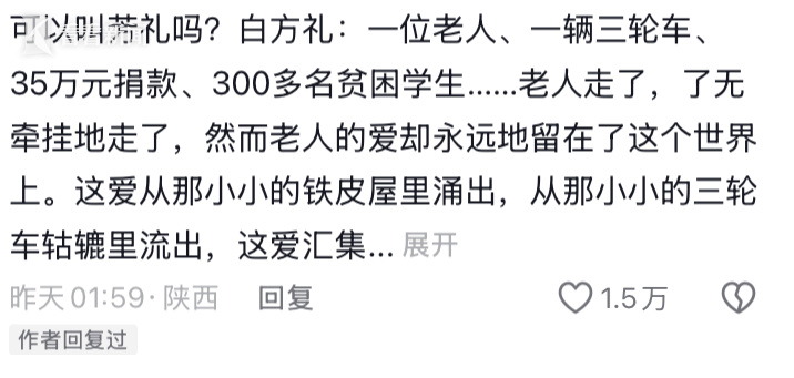 白方礼退休后,靠蹬三轮车挣钱支援教育事业,从73岁到88岁的15年里,几元几毛地攒下35万元,全都捐了出去,帮300多名穷孩子圆了大学梦。而他自己啃馒头喝白水,住简陋小屋,92岁离世时,没给后人留下一分积蓄。他一辈子都在托举寒门学子,2008年被追授为“感动中国”人物。
