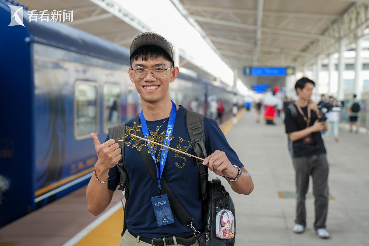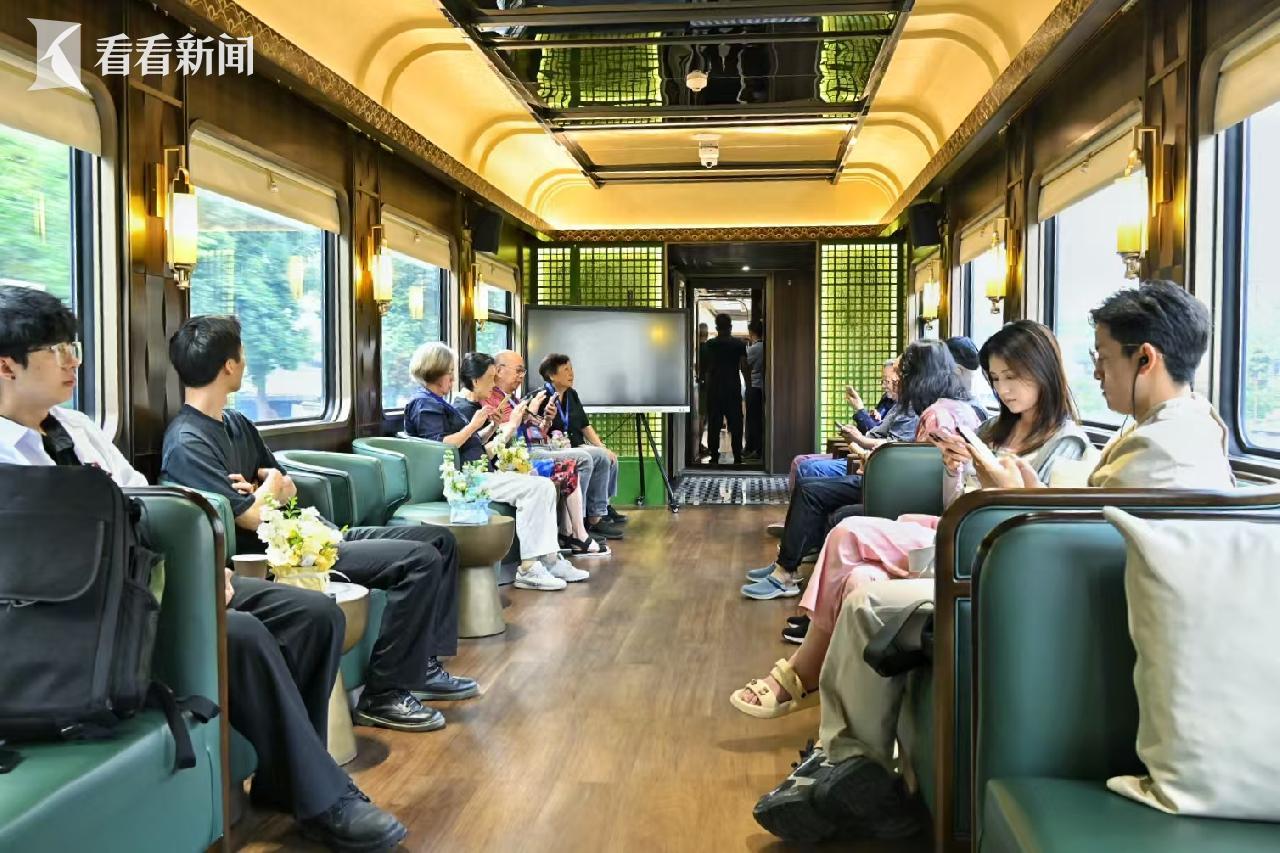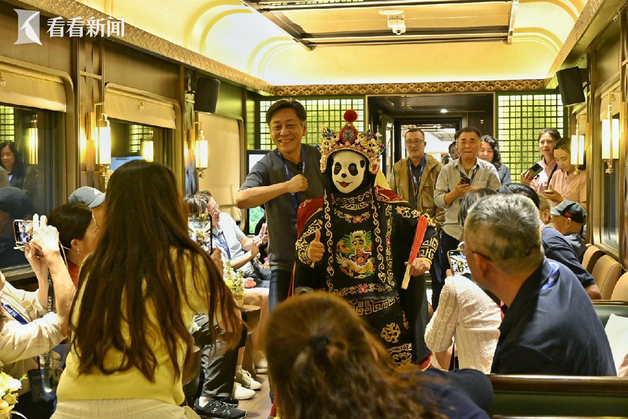 熊猫专列·成都号由中国铁路成都局集团公司与成都文旅集团共同打造的品质型旅游列车,车身为宝石蓝涂装,蜀山轮廓化作金色的线条,勾勒出蜀川千里江山图。整体以东方美学的传承、天府文化的表达、美好生活的创享为整体理念。车内设计将木芙蓉、银杏、竹子等天府文化传统元素与现代艺术巧妙融合,以“流动的艺术画廊”为载体,陈列有蜀锦、蜀绣、竹编等7大类近60幅国家级非遗臻品,让天府文化从静态展览变为可触可感的旅途记忆。2025年5月上线运营以来,熊猫专列·成都号在途运营151天,组织游客1085人次,六成以上游客为入境游客,不仅是旅游定制化服务的有效创新,更是展示中国文旅魅力的国际化窗口。