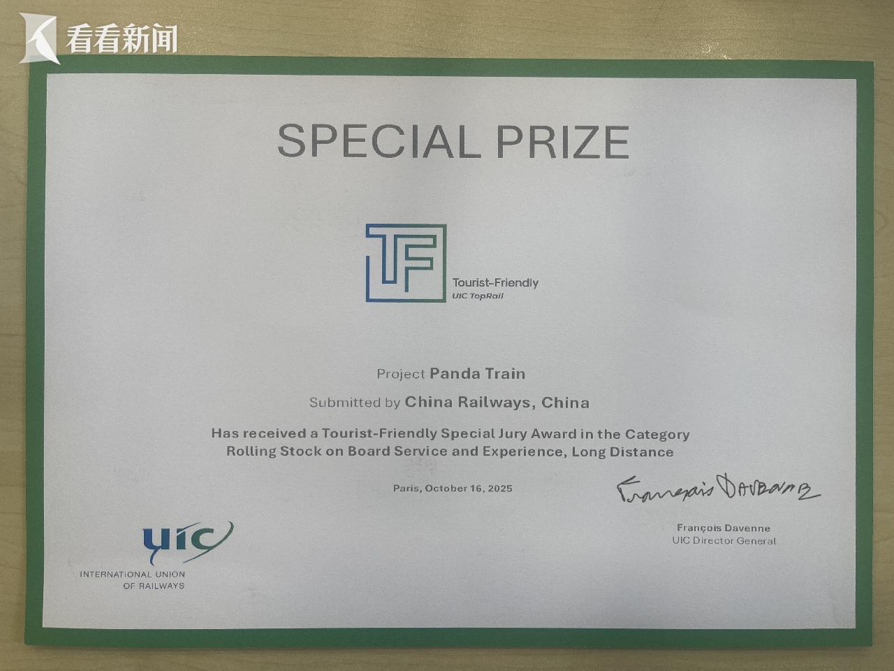 法国巴黎当地时间10月16日上午9点(北京时间10月16日下午15点)在巴黎国际铁路联盟总部举行的全球客运论坛开幕式专场活动上,“熊猫专列·成都号”被授予“长途旅游友好型列车及车上服务”类别“评审团特别奖”。