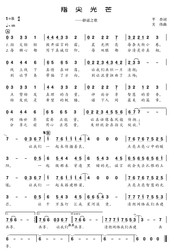 “指尖轻轻拨开谣言的霜,晨光照亮每条大街小巷……”在上海网络辟谣宣传周活动期间,嘉定区原创网络辟谣主题歌曲《指尖光芒》同步发布。《指尖光芒》由嘉定本土音乐人创作,歌曲由芊杏作词、关伟作曲、鄂莞婷演唱,以明快节奏和真挚歌词,呼吁大家在网络世界中保持清醒、传递善意。请跟随这首充满动感的歌曲,一起传播善良、点亮心中的暖阳。