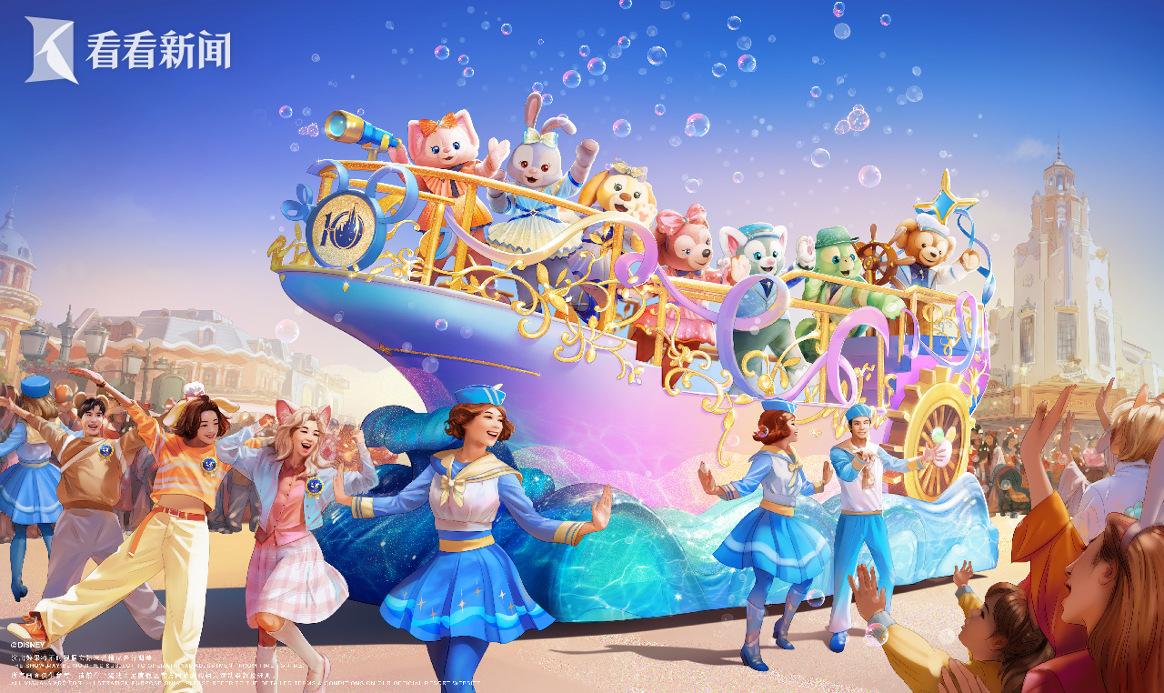 在标志性的“米奇童话专列”驶来之前,全新萌趣洋溢的“‘友谊号’: 达菲和朋友们的特别巡游”将率先登场。花车以璀璨的金色帆船为造型,车身绘有灵动的海浪纹样与望远镜等精巧细节,在温暖、欢乐与友谊的美好氛围中,为整场巡游拉开奇妙序幕。七位达菲和朋友们都将身着缤纷绚丽的庆典新装亮相,并邀请幸运游客加入巡游。