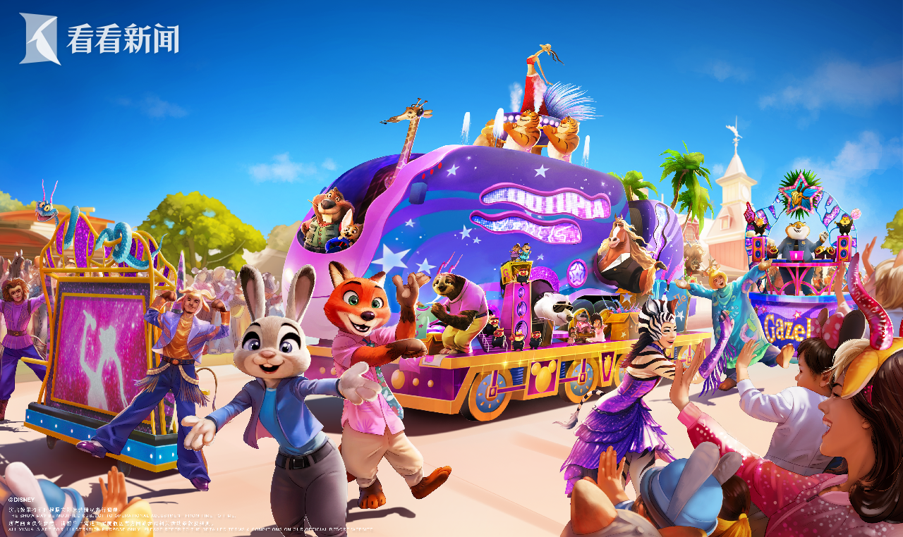 全新的疯狂动物城花车也将在“米奇童话专列”中活力登场,动物城超级巨星夏奇羊的演唱会巴士诚邀每一位游客一同加入这场盛大的狂欢派对!朱迪与尼克这对非凡搭档将领衔登场,在动物城 DJ 豹警官动感十足的节拍中,火力全开的动物城舞者和居民们随之尽情摇摆,点燃全场欢腾气氛。动物城居民们也纷纷展现独特魅力:蛇盖瑞灵活地扭动着身姿,新任动物城市长布莱恩∙马飞扬自信地倚窗致意,可爱的大先生一家以及更多角色悉数登场,伴随着《疯狂动物城》的主题曲《尝试一切》和《疯狂动物城 2》的主题曲《动物园》的旋律欢呼悦动,将巡游的热烈氛围推向高潮。