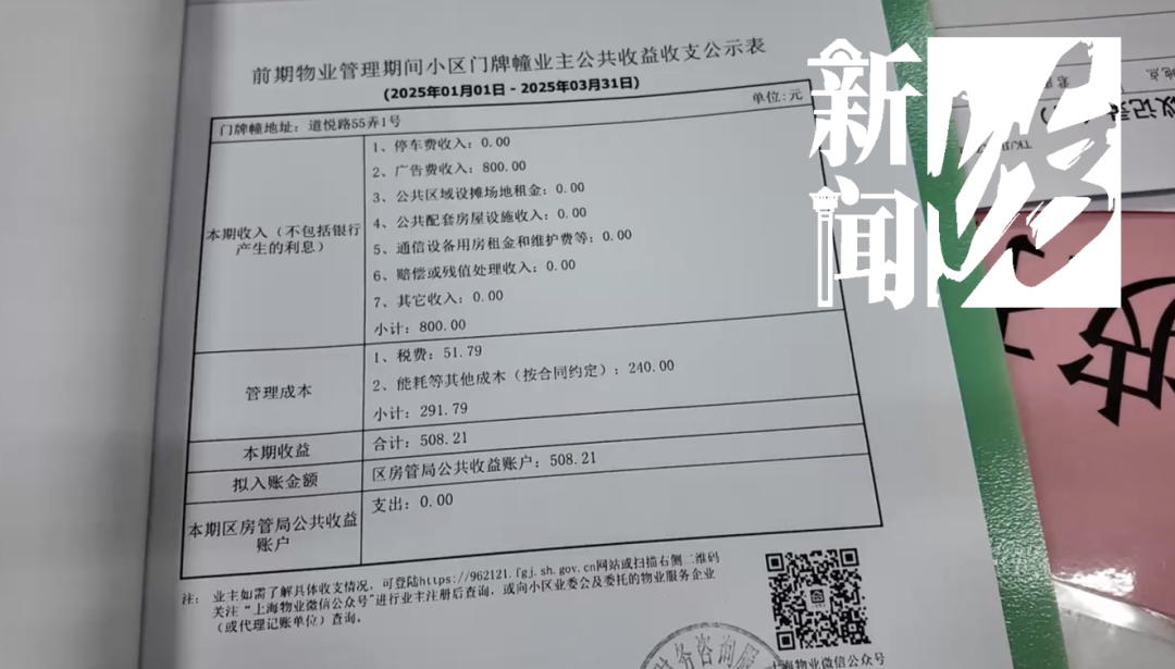 坊记在工作人员带领下,也在单元楼内部见到广告收入公示,上面记录“广告收入800元”,而其余收入则为零。