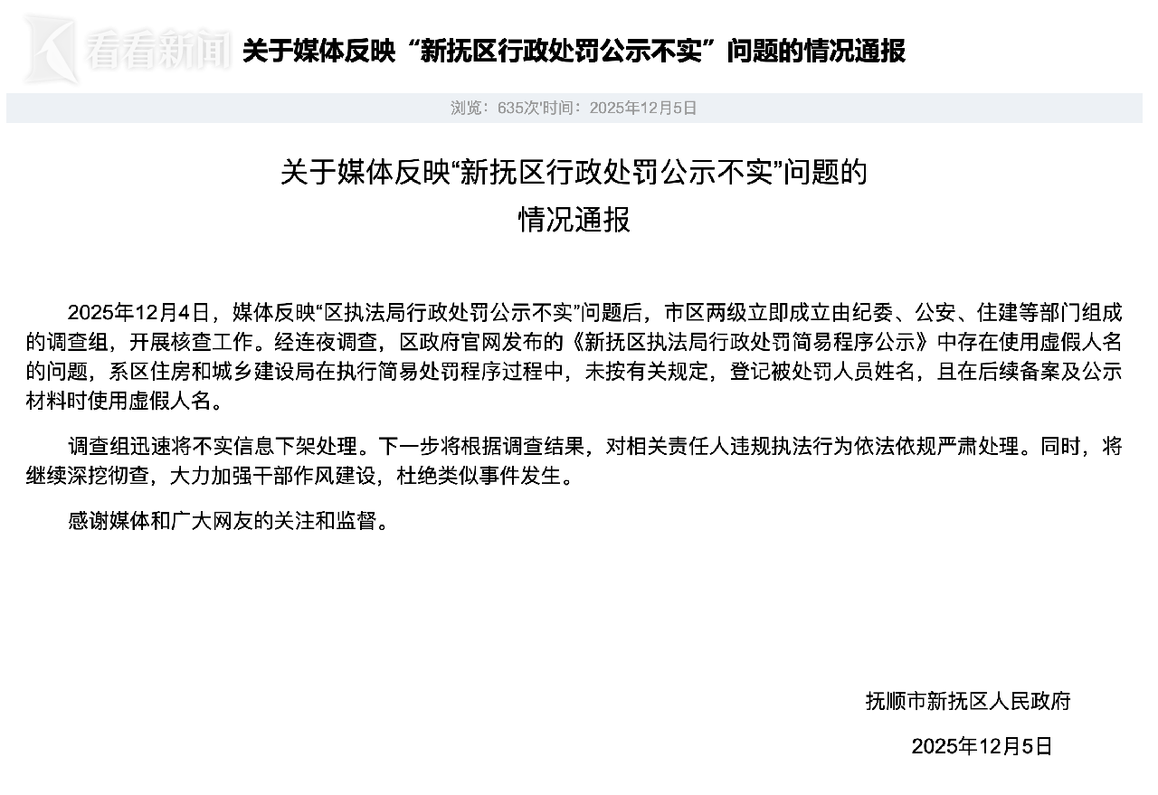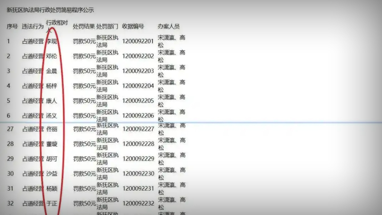 今天(12月5日)下午,涉事的抚顺市新抚区承认了,确实使用了虚假人名,将处理责任人。看似态度诚恳,却巧妙避开了公众真正关心的核心问题——造假原因何在?钱去了哪里?是懒政敷衍,还是蓄意做假账?另外,网友顺藤摸瓜,居然还找到了当地执法局另一份名单,50个“丁一”“李一”“陈一” “孙一”等重名者,齐刷刷被罚50元,合计2500元同样去向成谜,看来虚构罚款台账不是偶发事件。