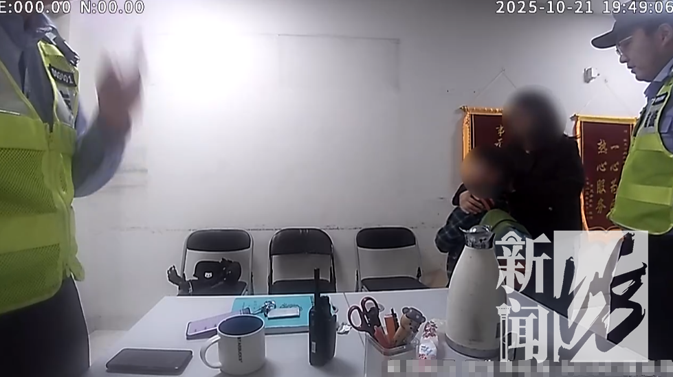 民警:我们这边是蓝天路警务室的,小孩现在是在警务室,问题不大。你别激动,没事的,你们谁过来接他,我们在警务室,靠近5号口的。