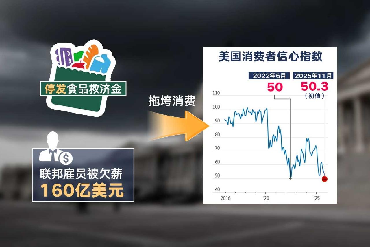 覆盖八分之一美国人口的“补充营养援助计划”史上首次停发食品救济金;联邦政府雇员被欠薪或高达160亿美元。各色人群收入减少,直接“带崩”了消费,美国消费者信心指数11月的初值暴跌至三年低点,较去年同期下降近三成。