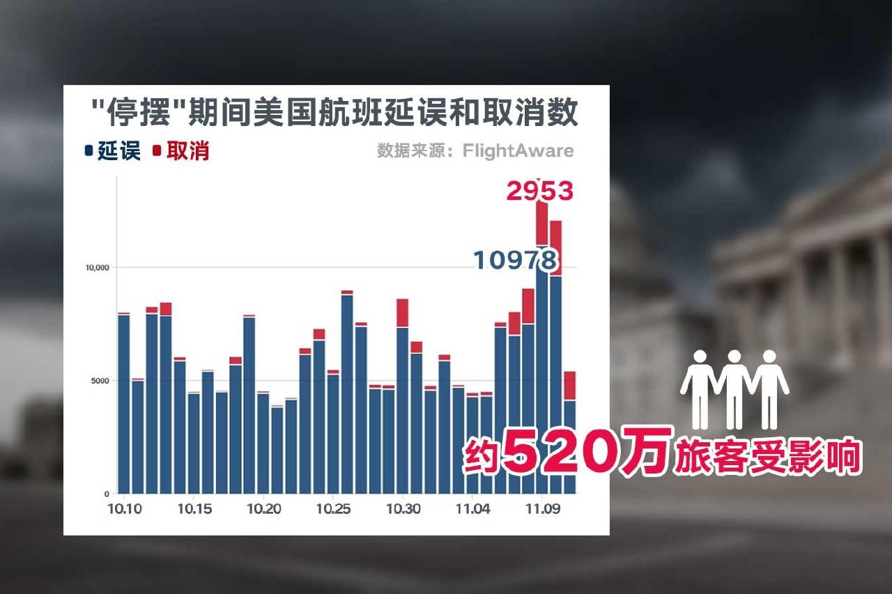美国总统特朗普12日签署国会两院通过的一项临时拨款法案,结束了已经持续43天的史上最长联邦政府“停摆”。尽管“停摆”结束,但不少“坏账”已难挽回。民航交通领域,共计约520万旅客受影响。最高峰的11月9日,一天就有近三千架次航班被取消,上万架次航班延误。