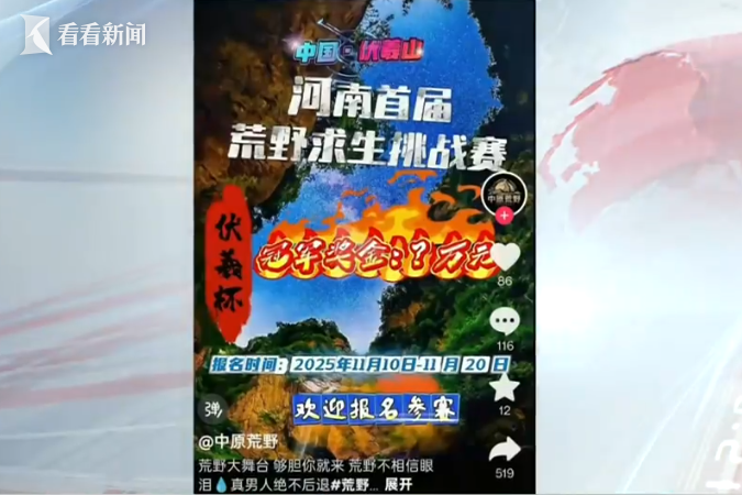 继湖南的七星山荒野求生挑战赛走红网络之后,网传位于河南新密的伏羲山也要来凑个热闹。本月9号,一个名叫“中原荒野”的短视频账号发布报名信息,宣布将于本月26号启动荒野求生活动,参赛者既可以选择花费480元报名,享受“包含三天三晚食宿”的服务;也可以选择花费980元报名,来享受独栋小木屋及接送服务。在决赛中生存30天以上、且坚持最久的胜出者,将获得5万元以上的奖励。消息发布后,迅速引发关注。不过,新密市文旅局和伏羲山风景区均对媒体表示,该活动并非其官方组织,而是一个“赛事团队”,活动地点听说是在伏羲山野外,目前还在报备中。