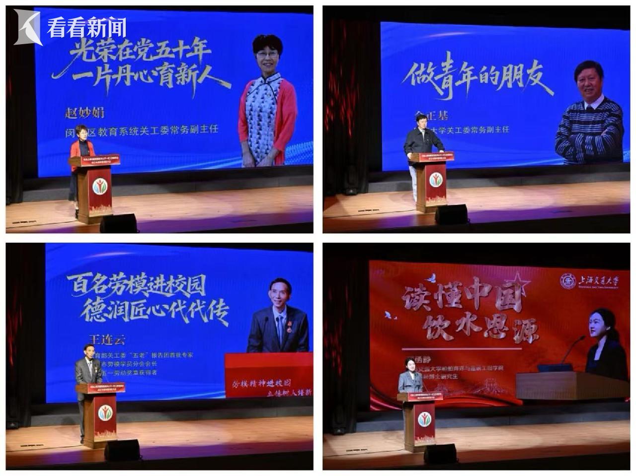 “五老故事”分享环节中,闵行区教育系统关工委赵妙娟讲述《光荣在党五十年 一片丹心有新人》,同济大学关工委金正基分享《做青年的朋友》,上海市劳模协会工会管理学院劳模学员分会会长王连云阐释《劳模精神永放光芒》,上海交通大学博士生蒋函静以《读懂中国 饮水思源》传递青年一代对“五老”的感恩之心,生动诠释“老少牵手、共促成长”的育人成效。