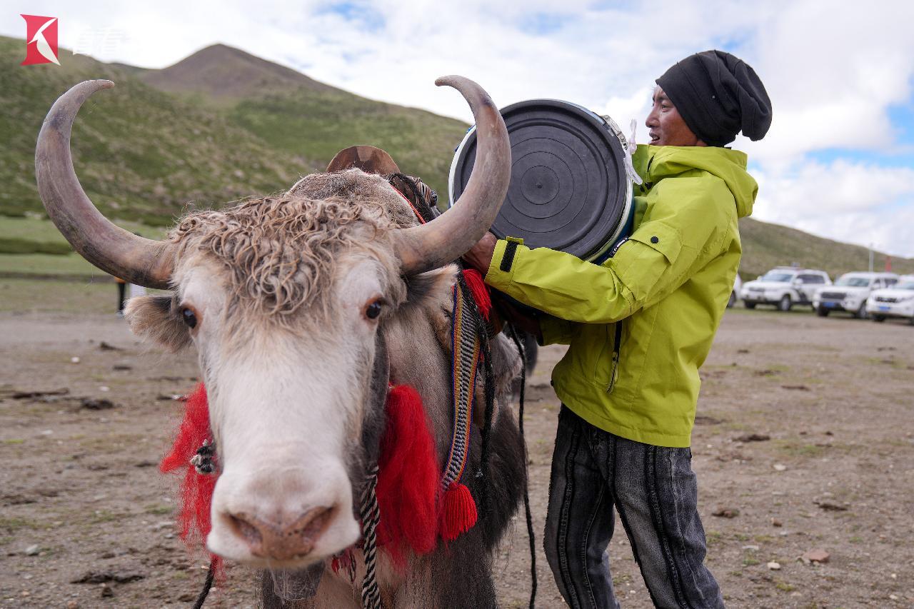 牦牛运输队队员往牦牛背上绑物资。