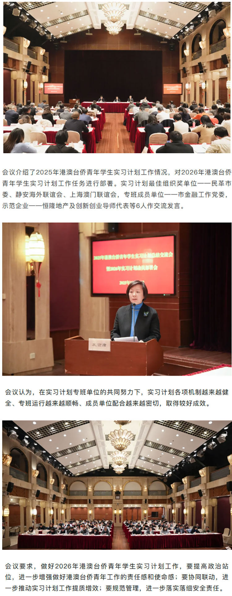 12月17日下午,2025年港澳台侨青年学生实习计划总结交流会暨2026年实习计划动员部署会召开。市委统战部副部长王珏出席并讲话,会议由市侨联党组成员、一级巡视员陶勇主持。实习计划工作专班项目负责人、联络员及示范企业、创新创业导师代表等近百人参会。