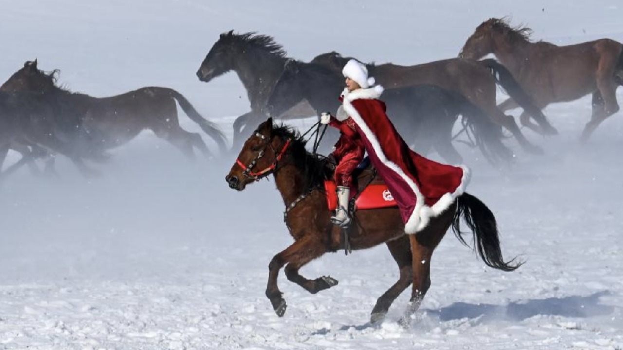 2020年12月31日,贺娇龙在昭苏县天马旅游文化园策马雪原,为家乡宣传。李文武摄
